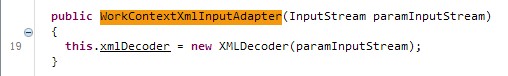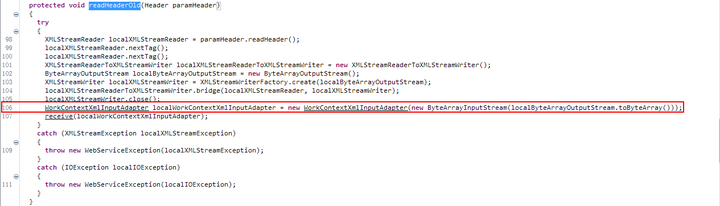 在106行,有一句new WorkContextXmlInputAdapter(new ByteArrayInputStream(localByteArrayOutputStream.toByteArray())),创建了WorkContextXmlInputAdapter()对象(即对WorkContextXmlInputAdapter类进行了实例化),带入构造函数的参数即为传入的XML格式序列化数据。