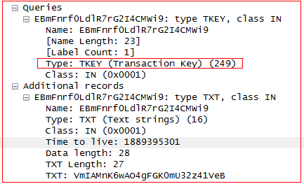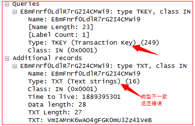 图中标4处:在运行到图中标4处,通过dns_message_findtype函数查找在DNS_SECTION_ADDITIONAL结构有没有对应的TKEY类型。从下图可以在DNS_SECTION_ADDITIONAL结构中的类型为TXT类型,所以这里会返回错误。