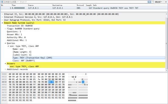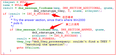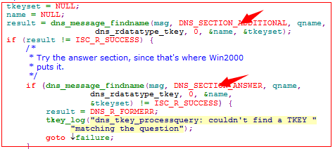 从第一次调用dns_message_findname结果来看,如果queries结构和additional结构中的name字段相同,但是additional结构的type字段只要不是TKEY就会返回错误。
