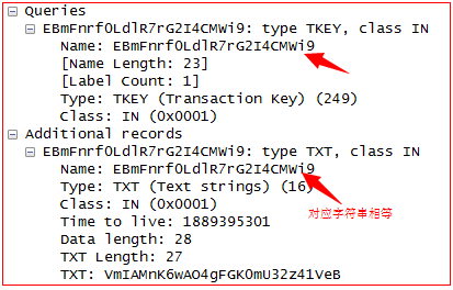 从dns_key_processquery函数可知,在函数内部两次调用了dns_message_findname;其中dns_message_findname函数大致意思是根据第二个参数DNS_SECTION_ADDITIONAL查找匹配的第三个参数qname,如果找到就放在第六个参数name中,并将返回结果保存到result中;第一次调用dns_message_findname时,传入的第二个参数是DNS_SECTION_ADDITIONAL,第三个参数查询的字符串,如果找到对应的字符串就放入name中,结合数据包,如图所示: