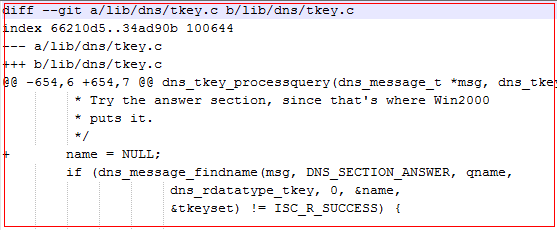 从官方给出的补丁对比来看,在第二次调用dns_message_findname之前再次将name置空,这样在第二次运行断言语句时name=NULL,也就不会出现崩溃的现象。