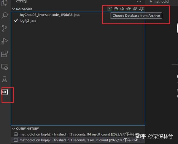 在所下载的CodeQL插件中,点击Choose Database from Archive,选择上述生成的database导入。