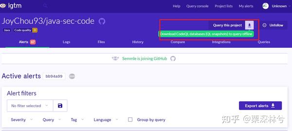 2. 点击Follow,在下面列表会产生该项目,再点击Enable PR code reviews,进入如下界面,鼠标移到Query this project,点击下载数据库即可。