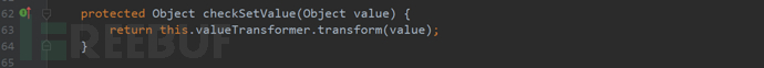 TransoformedMap类的关键点在checkSetValue()方法,我们构造好的含有利用代码的ChainedTransformer利用链即transformers数组会循环进入此处。