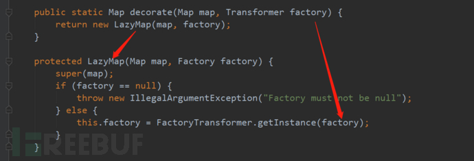 LazyMap的构造函数是受保护protected的,只有他自身或者继承他的类可以用,我们不能通过构造函数传参。但其有一个decorate()方法,其参数2为Transformer类型,因此可以利用这个方法创建一个LazyMap对象,相关代码如下: