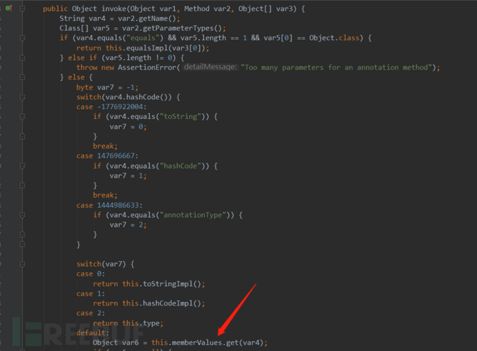 如上代码所示,其主要作用是当代理的对象调用toString,hashCode,annotationType时,就返回相应的结果,如果调用了其他方法,就会去执行Object var6= this.memberValues.get(var4)。