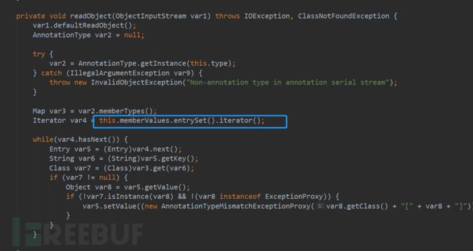 this.memberValues是可控的,当其是一个AnnotationInvocationHandler类生成的动态代理对象时,在调用entrySet()方法时,会自动去调用invoke方法,而由于其调用的不是toString,hashCode等方法,就会执行Object var6 = this.memberValues.get(var4),从而完成攻击链条,导致代码执行。